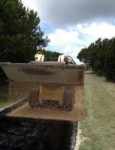 A layer of loose stone is then spread over the hot tar and raked to cover.